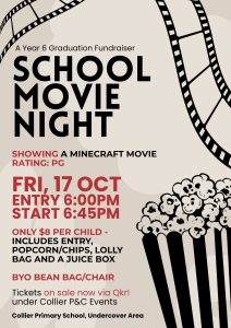 🎬 SCHOOL MOVIE NIGHT – Friday, 17 October! Arrive 6pm for a 6.45pm start. Bring beanbags and blanket.